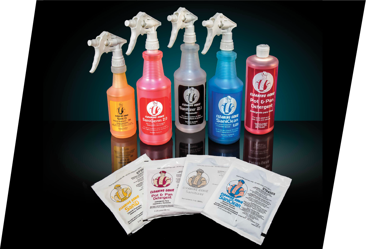 We provide all of the cleaning and sanitizing chemicals necessary to keep your cafeterias in tip-top condition. Our products have been packaged to simplify mixing and eliminate guesswork for employees. Just fill the container to the premeasured line with water and add 1 packet. In addition, our products are color-coded to their labels, containers, instructions, and safety data sheets for easy recognition and handling.